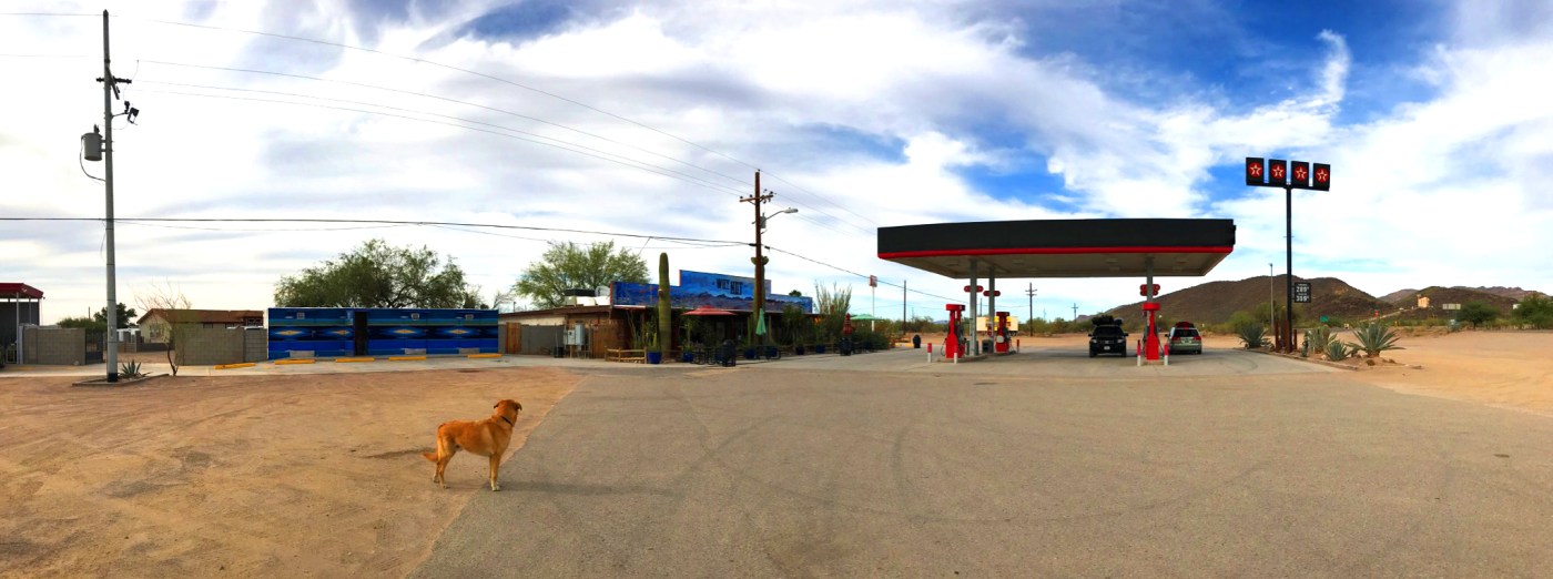 Positives from the long stop at Why were that Ted got to stretch his legs and Nina got a popsicle. Ready to drive away, we were greeted by a coyote who apparently owned the place; crazy are the things you see in the desert. We got a photo of the coyote. As we approached a random US Border Patrol checkpoint (not at the border, mind you, still squarely in the USA), I snapped a pic with my phone and was promptly stopped and required to delete said picture before we could pass. I had thought I had rights which I guess, in fact, I do not possess.